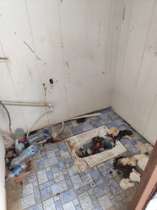سرویسهای بهداشتی: بدون آب با درب های شکسته همچنین پر از کثافت و زباله، فاقد استانداردهای اولیه بهداشتی .